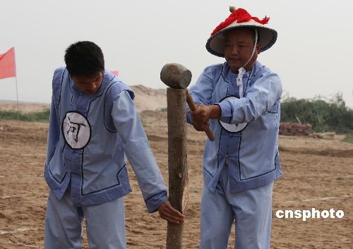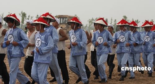 5月27日,河南郑州黄河滩上,一队"清兵"在黄河滩上进行抢险。当日,河南黄河河务局在郑州中牟举行黄河防汛实战演练,上阵表演的抢险队身着酷似"清兵"的衣服喊着高亢的黄河号子打下木桩,继承古代治理黄河之法,创新现代治黄之术。中新社发 王中举 摄
