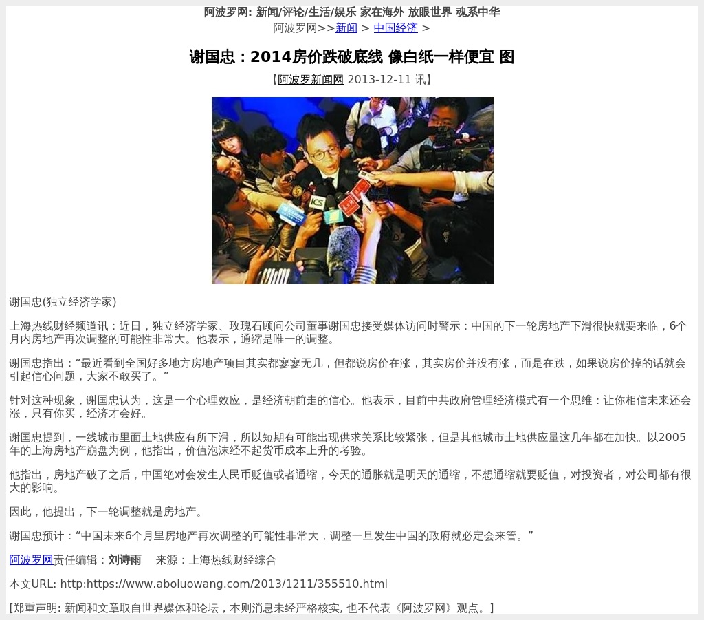 谢国忠:2014房价跌破底线 像白纸一样便宜 图