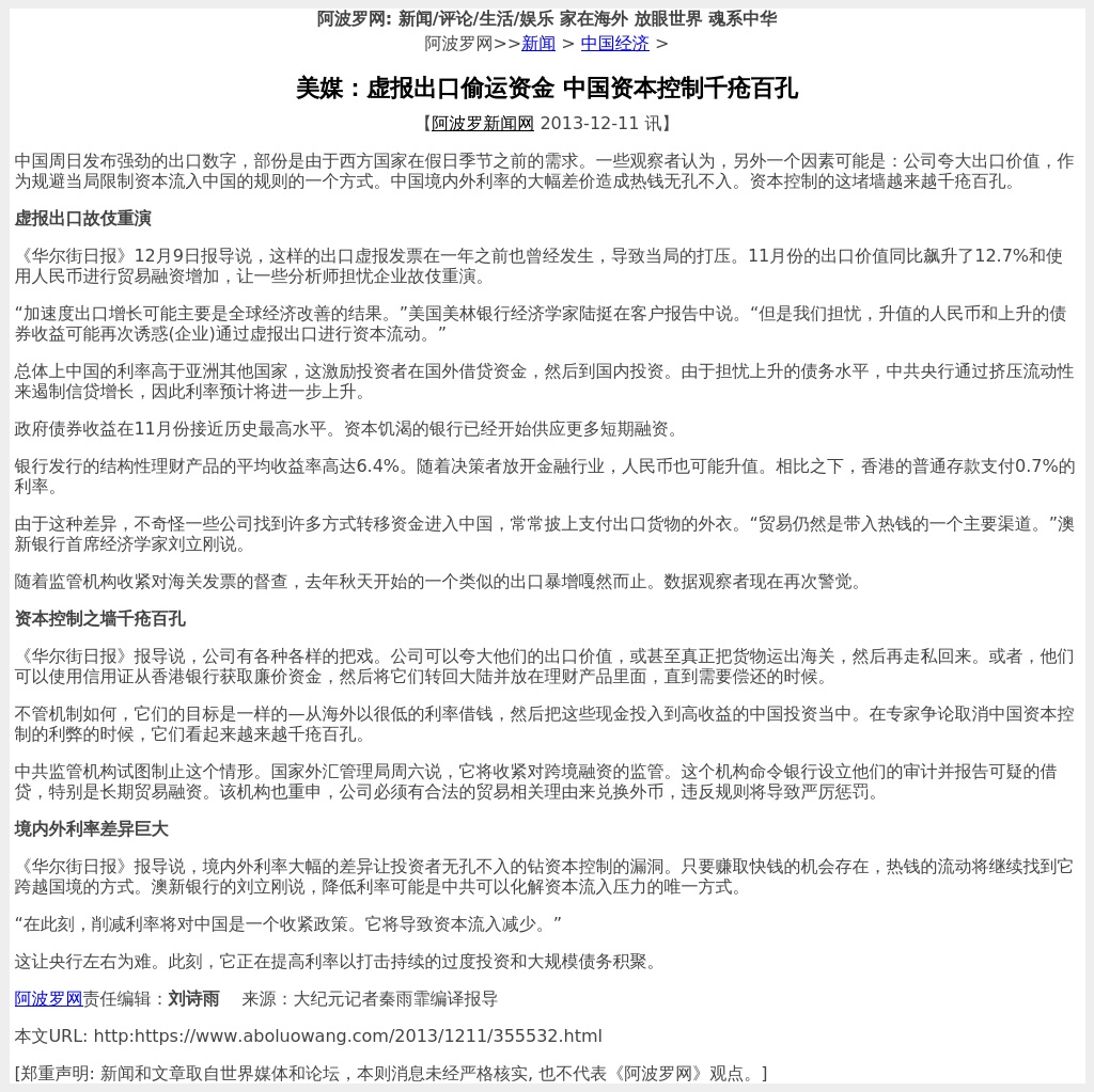 美媒:虚报出口偷运资金 中国资本控制千疮百孔