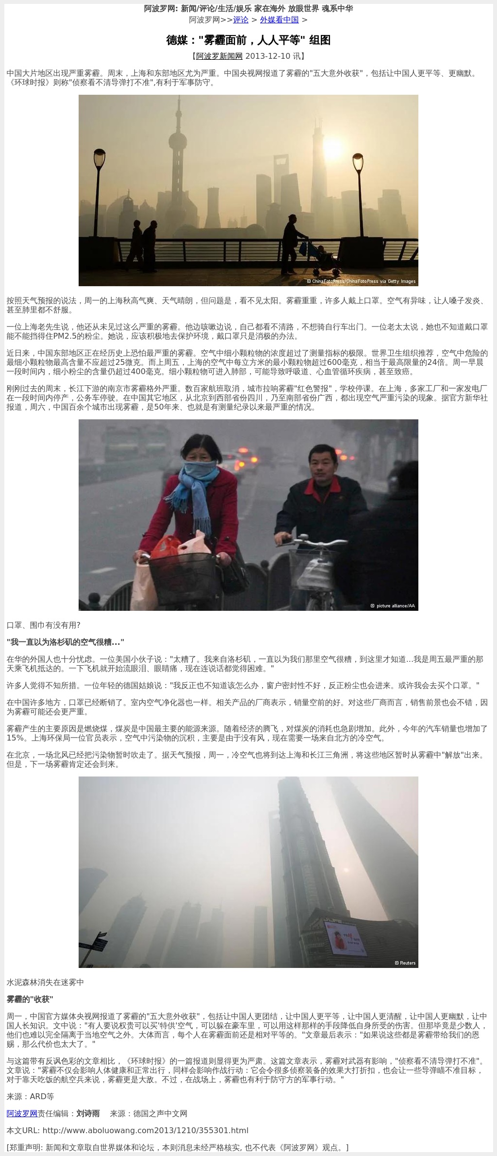 中国大片地区出现严重雾霾。周末,上海和东部地区尤为严重。中国央视网报道了雾霾的"五大意外收获",包括让中国人更平等、更幽默。《环球时报》则称"侦察看不清导弹打不准",有利于军事防守。