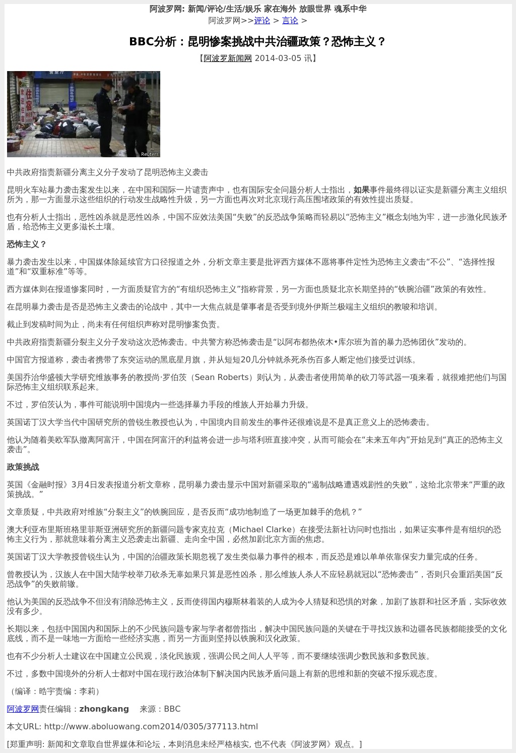 BBC分析:昆明惨案挑战中共治疆政策?恐怖主义?