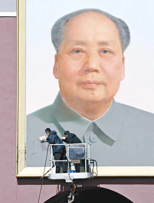全�人大政���期�,一名男子昨午向��在北京天安�城�的巨型毛���像�墨,��不明。�是毛像第三次遭破�,警方���肇事者拘捕�走,�封���修��像。