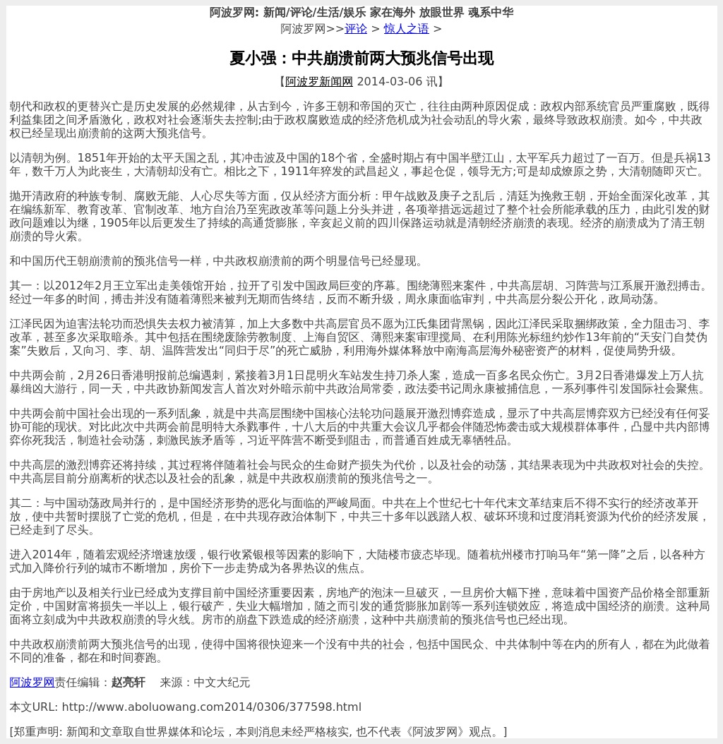 朝代和政权的更替兴亡是历史发展的必然规律,从古到今,许多王朝和帝国的灭亡,往往由两种原因促成:政权内部系统官员严重腐败,既得利益集团之间矛盾激化,政权对社会逐渐失去控制;由于政权腐败造成的经济危机成为社会动乱的导火索,最终导致政权崩溃。如今,中共政权已经呈现出崩溃前的这两大预兆信号。