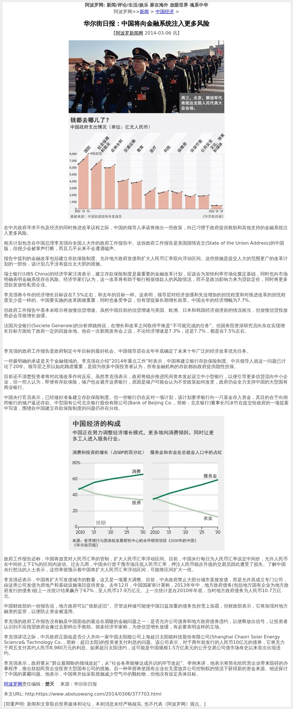 一些最明确的承诺是关于金融领域的。李克强在介绍“2014年重点工作”时表示,中国将建立银行存款保险制度。中共领导人就这一问题已讨论了20年。领导层之所以如此顾虑重重,是因为很多中国投资者认为,所有金融机构的存款都由政府提供隐性担保。