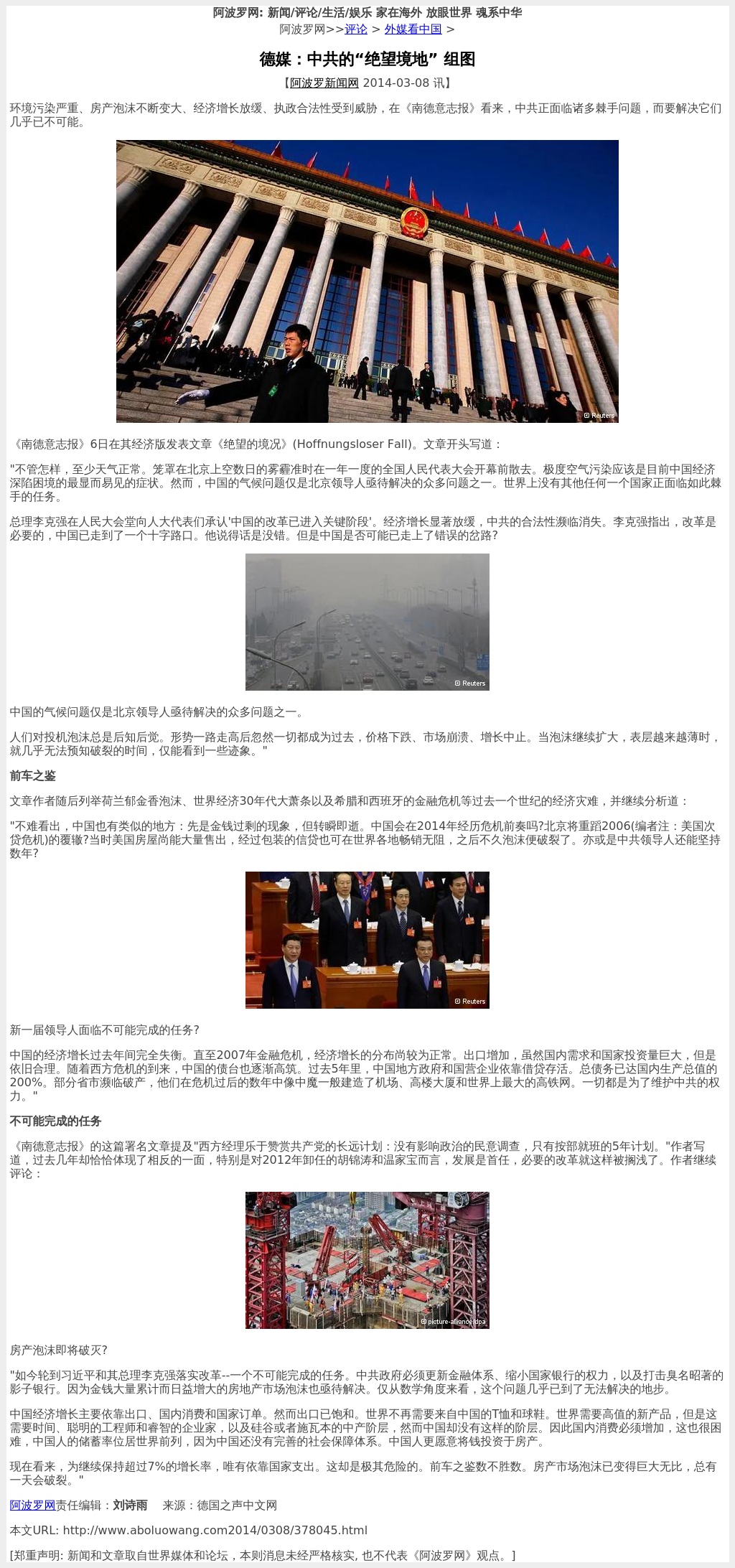 环境污染严重、房产泡沫不断变大、经济增长放缓、执政合法性受到威胁,在《南德意志报》看来,中共正面临诸多棘手问题,而要解决它们几乎已不可能。