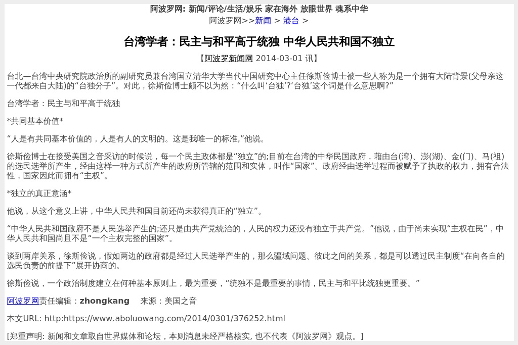 台湾学者:民主与和平高于统独 中华人民共和国不独立
