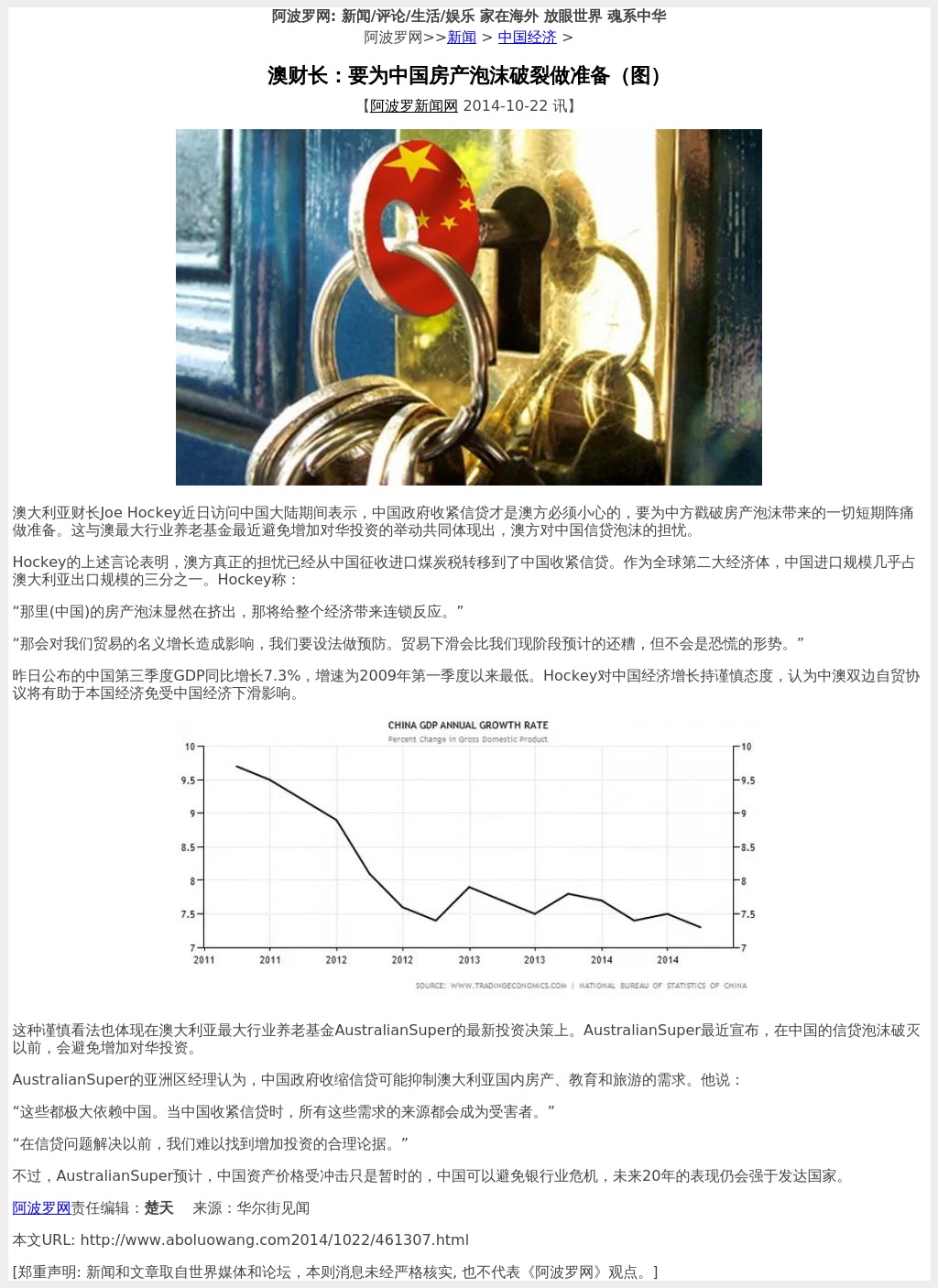 澳财长:要为中国房产泡沫破裂做准备(图)